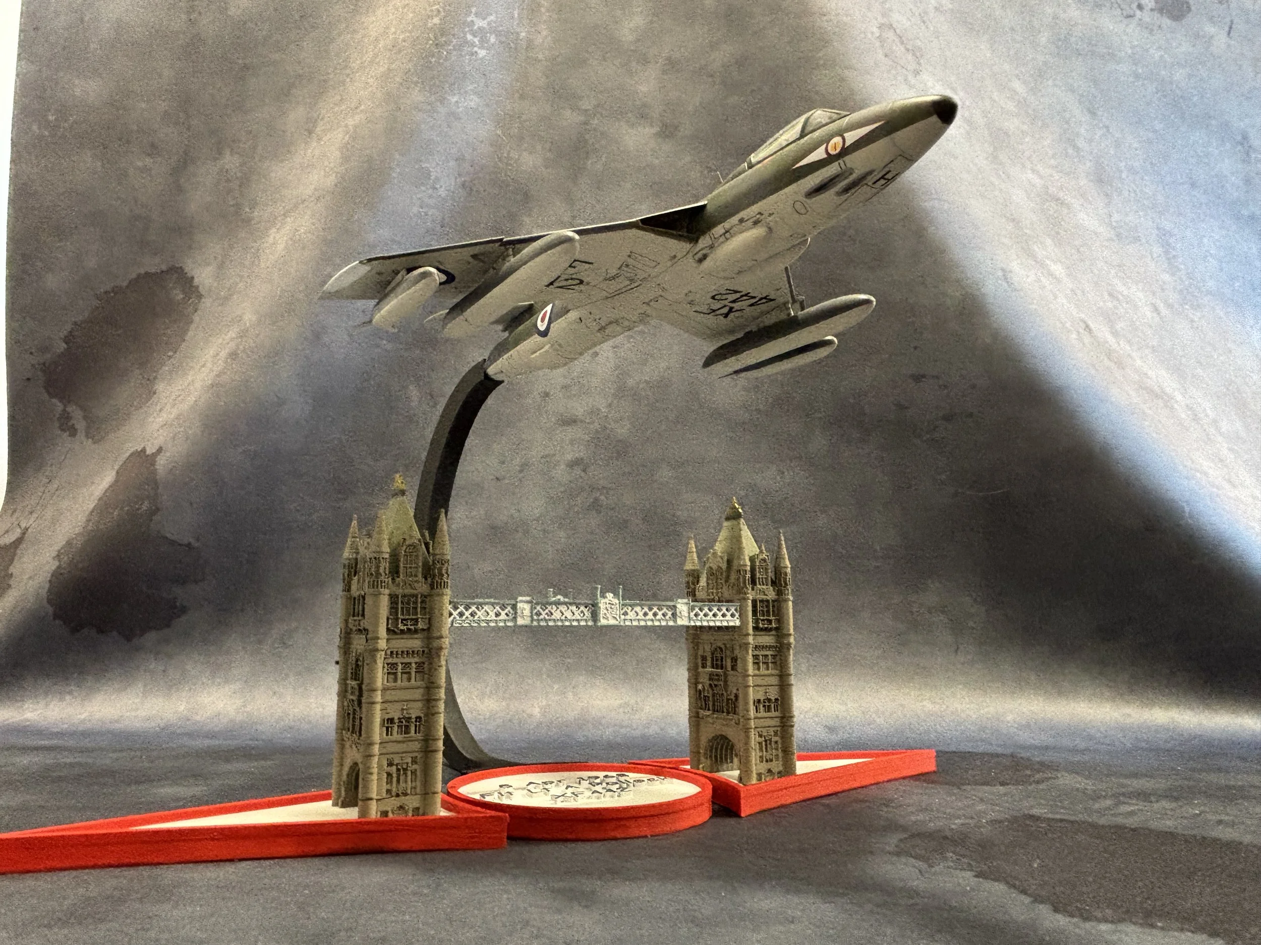 Airfix Hawker Hunter Flt Lt Pollock Flies Through Tower Bridge. 3d printed Tower Bridge shrunk to 17% size CAD 1(F) Sqn Fighter Bars produced by Dreamscale Artisan