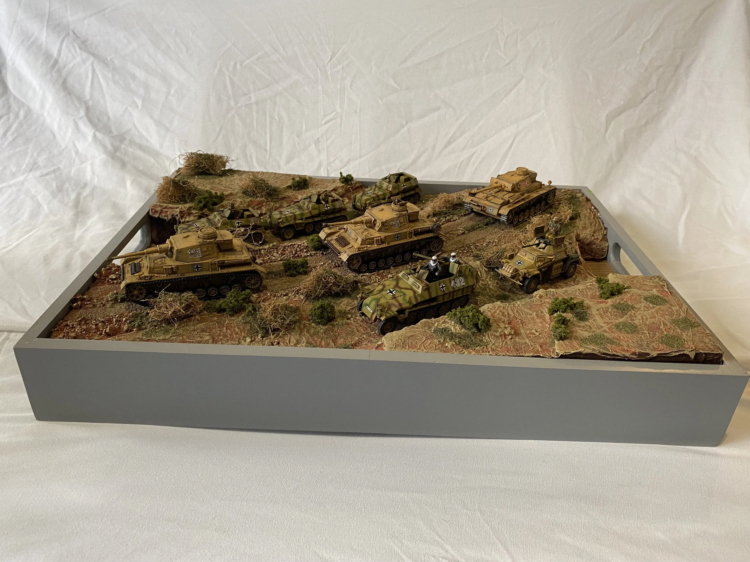 WW2 Tunisia/Sicily Diorama Hard styrene base blocks shaved to contours with rasp Plaster/PVA & Toilet paper overlay for coarse terrain Mounted in Tea tray